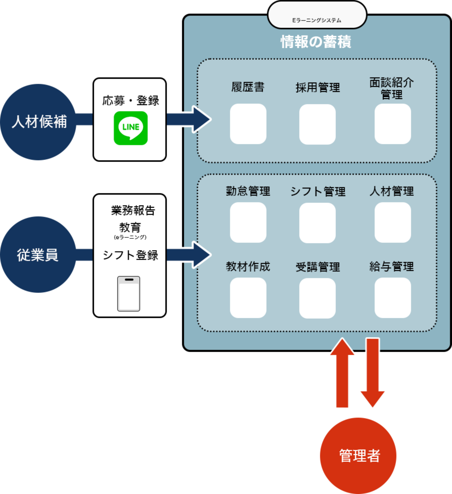 採用候補者や従業員が登録した情報はe-Learningのシステム内に蓄積され、管理者はその情報をいつでも閲覧することが可能です。